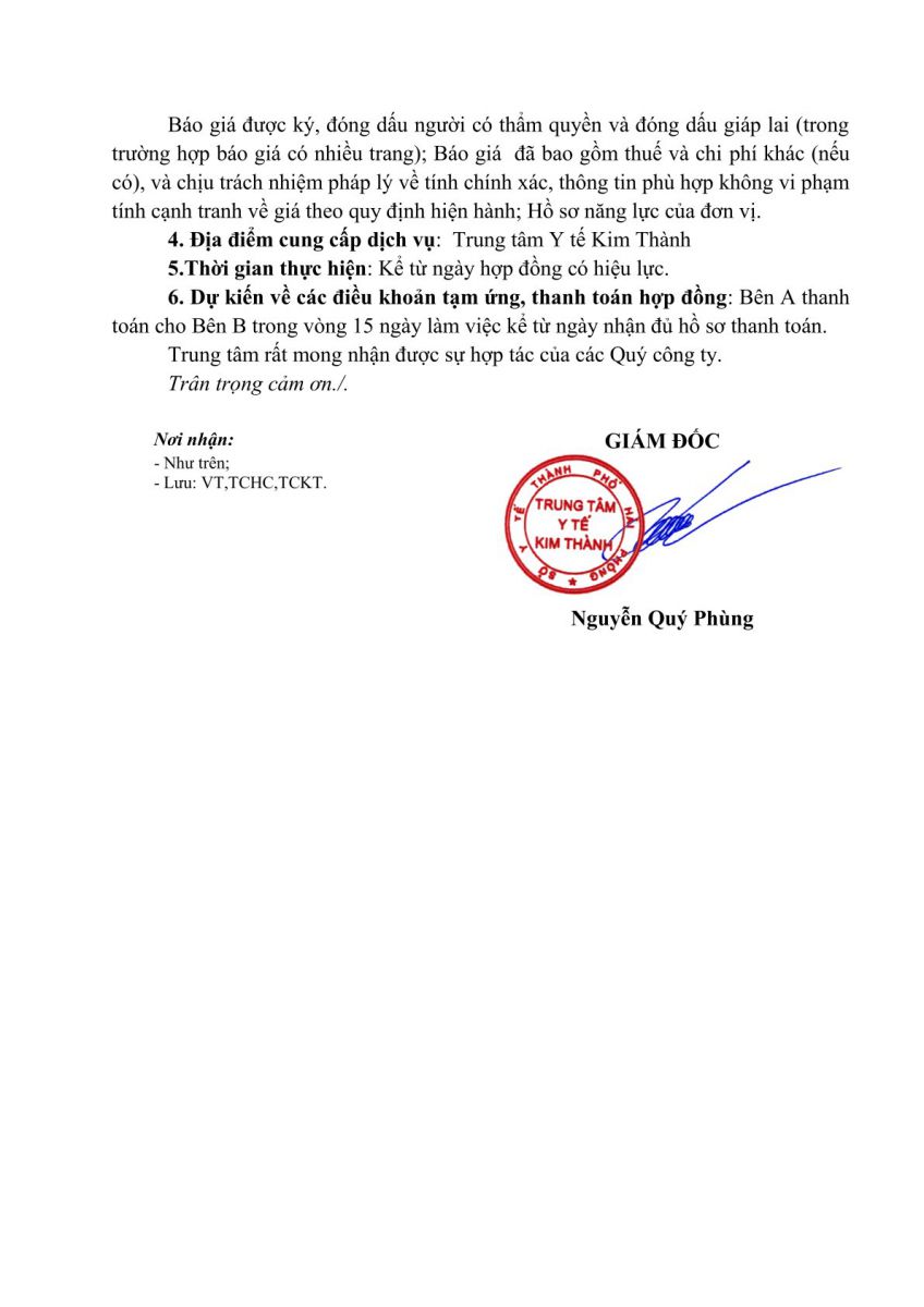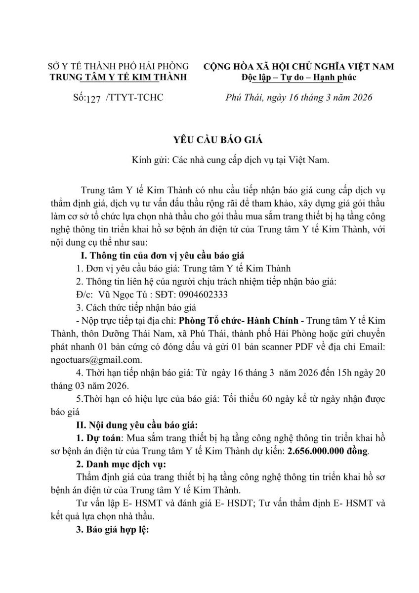 Trung tâm Y tế Kim Thành có nhu cầu tiếp nhận báo giá cung cấp dịch vụ thẩm định giá, dịch vụ tư vấn đấu thầu rộng rãi để tham khảo, xây dựng giá gói thầu làm cơ sở tổ chức lựa chọn nhà thầu cho gói thầu mua sắm trang thiết bị hạ tầng công nghệ thông tin triển khai hồ sơ bệnh án điện tử của Trung tâm Y tế Kim Thành, với nội dung cụ thể như sau: