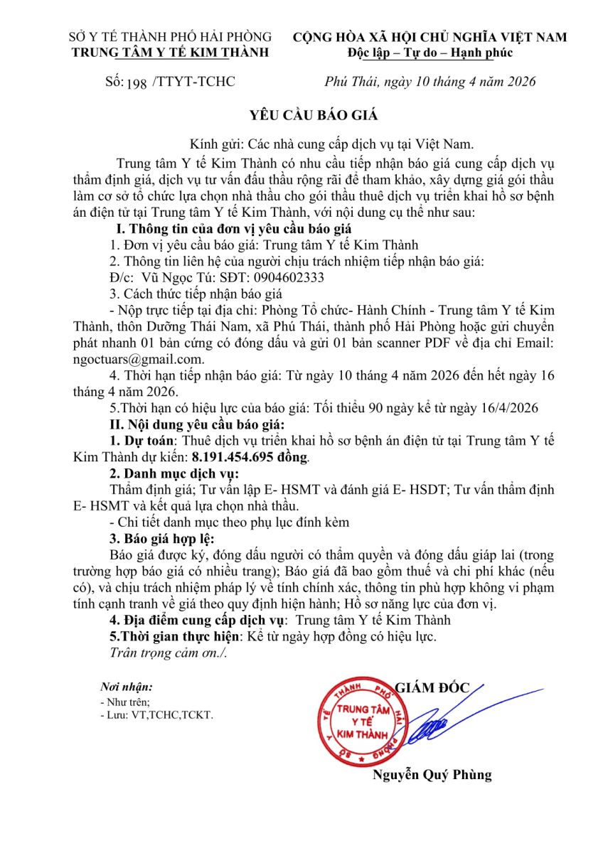 Trung tâm Y tế Kim Thành có nhu cầu tiếp nhận báo giá cung cấp dịch vụ thẩm định giá, dịch vụ tư vấn đấu thầu rộng rãi để tham khảo, xây dựng giá gói thầu làm cơ sở tổ chức lựa chọn nhà thầu cho gói thầu thuê dịch vụ triển khai hồ sơ bệnh án điện tử tại Trung tâm Y tế Kim Thành, với nội dung cụ thể như sau: