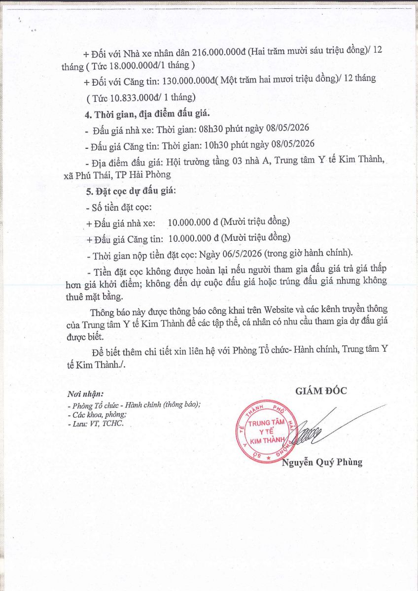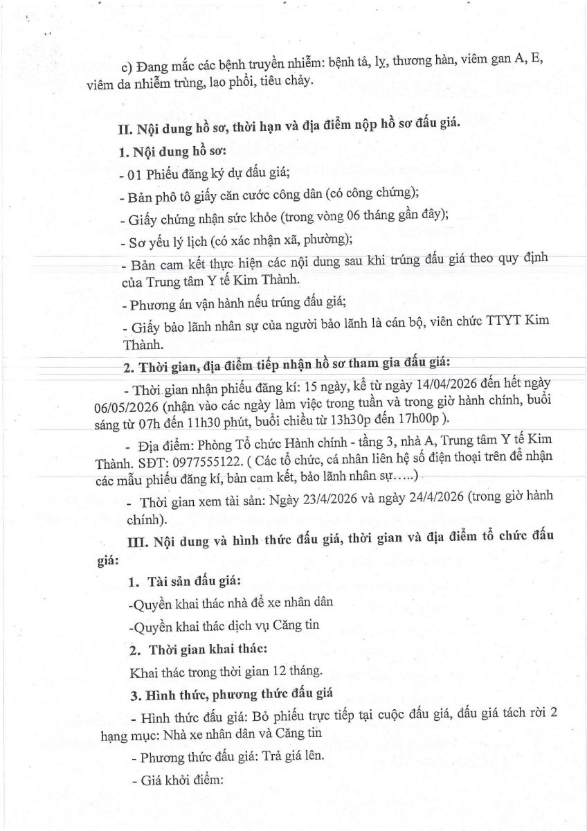 Trung tâm y tế Kim Thành thông báo về việc Tổ chức lựa chọn đấu giá cho thuê mặt bằng trông giữt xe nhân dân và căng tin tại Trung tâm năm 2026, cụ thể như sau: