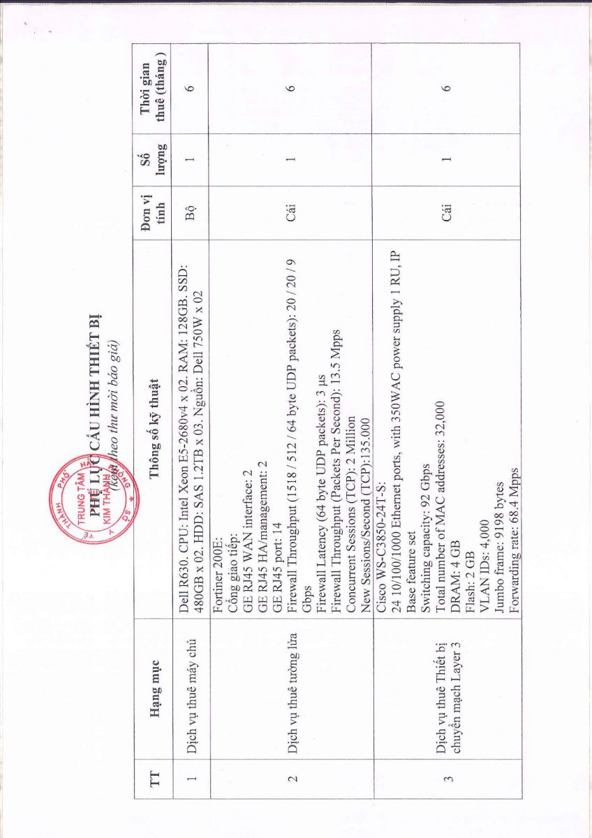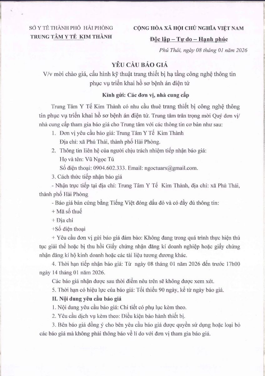 Trung tâm Y tế Kim Thành có nhu cầu thuê trang thiết bị công nghê thông tin phục vụ triển khái hồ sơ bệnh án điện tử. Trung tâm Y tế Kim Thành trân trọng kính mời Quý đơn vị, nhà cung cấp tham gia báo giá với thông tin như sau: