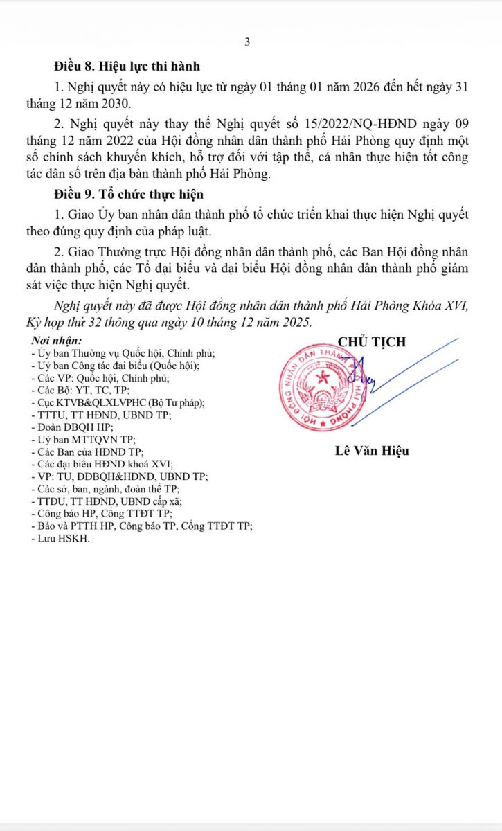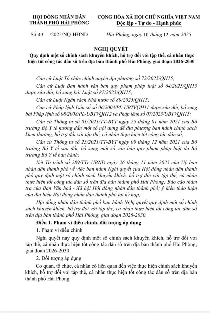Nghị quyết số 49/2025/NQ-HĐND ngày 10/12/2025 của Hội đồng nhân dân thành phố Hải Phòng về "Quy định một số chính sách khuyến khích, hỗ trợ đối với tập thể, cá nhân thực hiện tốt công tác dân số trên địa bàn thành phố Hải Phòng, giai đoạn 2026-2030".