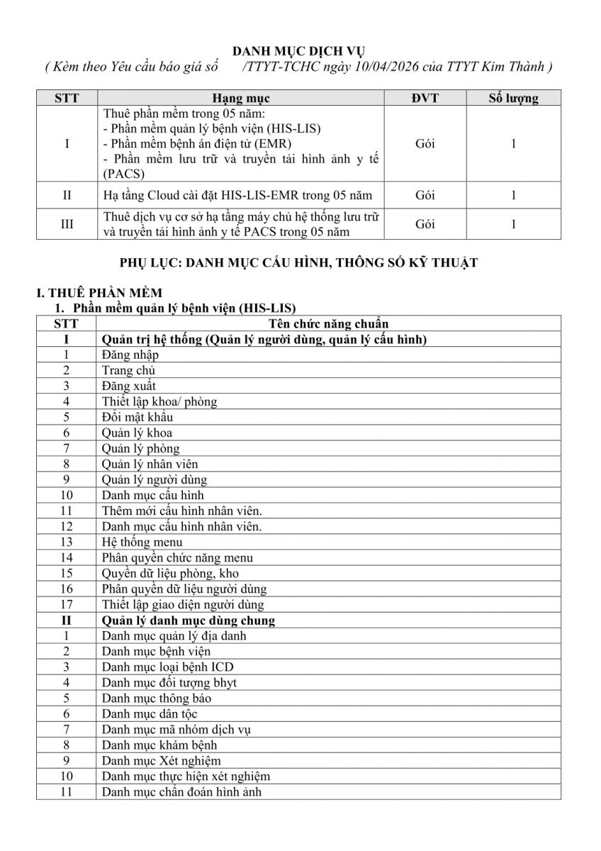 Trung tâm Y tế Kim Thành có nhu cầu tiếp nhận báo giá cung cấp dịch vụ thẩm định giá, dịch vụ tư vấn đấu thầu rộng rãi để tham khảo, xây dựng giá gói thầu làm cơ sở tổ chức lựa chọn nhà thầu cho gói thầu thuê dịch vụ triển khai hồ sơ bệnh án điện tử tại Trung tâm Y tế Kim Thành, với nội dung cụ thể như sau: