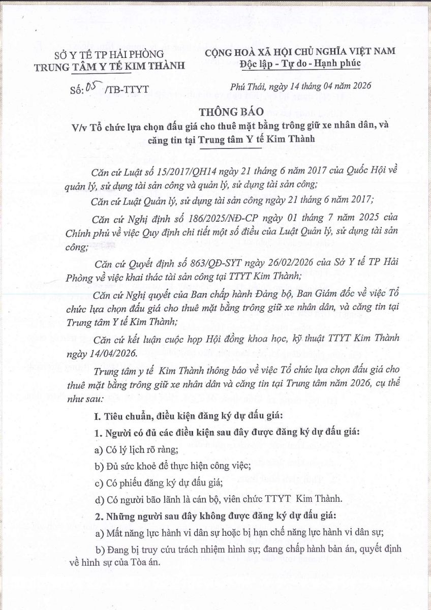 Trung tâm y tế Kim Thành thông báo về việc Tổ chức lựa chọn đấu giá cho thuê mặt bằng trông giữt xe nhân dân và căng tin tại Trung tâm năm 2026, cụ thể như sau: